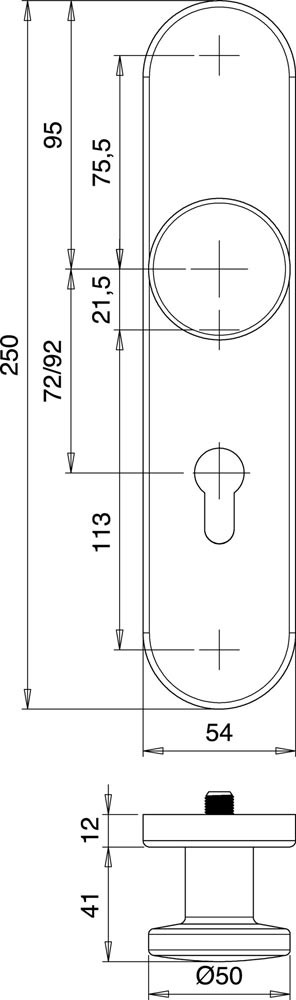 Grundkonstruktion: Druckguss mit 2 mm Teilstahleinlage im Außenschild, oberflächengehärtet · Stärke Innenschild = 8 mm · Drücker-Lagerung: lose · Drückertyp und -stärke: 108 mit Ø 22 mm · Knopfausführung bei Wechselgarnitur: Modell …/0272 und …/0292 = K2 (gekröpft), bzw. Modell …/0772 und …/0792 = K7 (gerade) · Stütznocken: M6, Ø 10 mm anbohrgeschützt · Verschraubung: 3-fach M6, verdeckt · Anbohrschutz beim Außenschild · Wechselgarnituren mit Spezialrollenwechselstift mit M12-Gewinde · DIN links / rechts · ohne Zylinderabdeckung · Widerstandsklasse ES1
