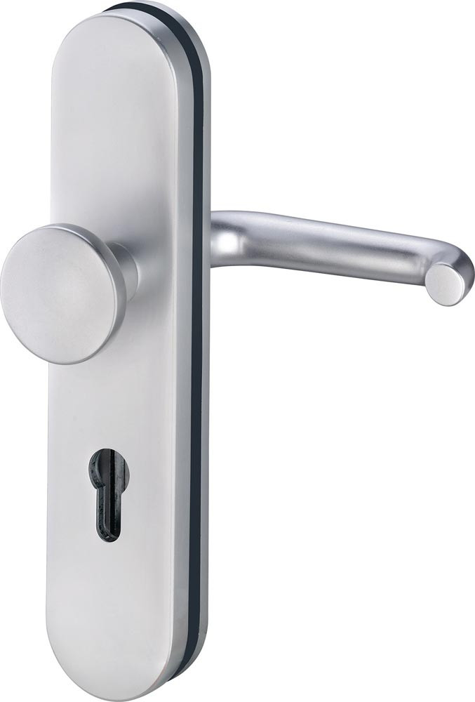 Grundkonstruktion: Druckguss mit 2 mm Teilstahleinlage im Außenschild, oberflächengehärtet · Stärke Innenschild = 8 mm · Drücker-Lagerung: lose · Drückertyp und -stärke: 103 mit Ø 22 mm, bzw. bei Alu 8 mm VKT = 104 mit Ø 18 mm · Knopfausführung bei Wechselgarnitur: Modell …/0272 und …/0292 = K2 (gekröpft), bzw. Modell …/0772 und …/0792 = K7 (gerade) · Stütznocken: M6, Ø 10 mm anbohrgeschützt · Verschraubung: 3-fach M6, verdeckt · Anbohrschutz beim Außenschild · Wechselgarnituren mit Spezialrollenwechselstift mit M12-Gewinde · DIN links / rechts · ohne Zylinderabdeckung · Widerstandsklasse ES1