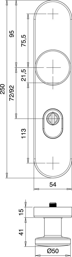 Grundkonstruktion: Druckguss mit 2 mm Teilstahleinlage im Außenschild, oberflächengehärtet · Stärke Innenschild = 8 mm · Drücker-Lagerung: lose · Drückertyp und -stärke: 103 mit Ø 22 mm, bzw. bei Alu 8 mm VKT = 104 mit Ø 18 mm · Knopfausführung bei Wechselgarnitur: Modell …/0272 und …/0292 = K2 (gekröpft), bzw. Modell …/0772 und …/0792 = K7 (gerade) · Stütznocken: M6, Ø 10 mm anbohrgeschützt · Verschraubung: 3-fach M6, verdeckt · Anbohrschutz beim Außenschild · Wechselgarnituren mit Spezialrollenwechselstift mit M12-Gewinde · mit Zylinderabdeckung: federnd gelagert für 12 - 17 mm Überstand · DIN links / rechts · Widerstandsklasse ES1