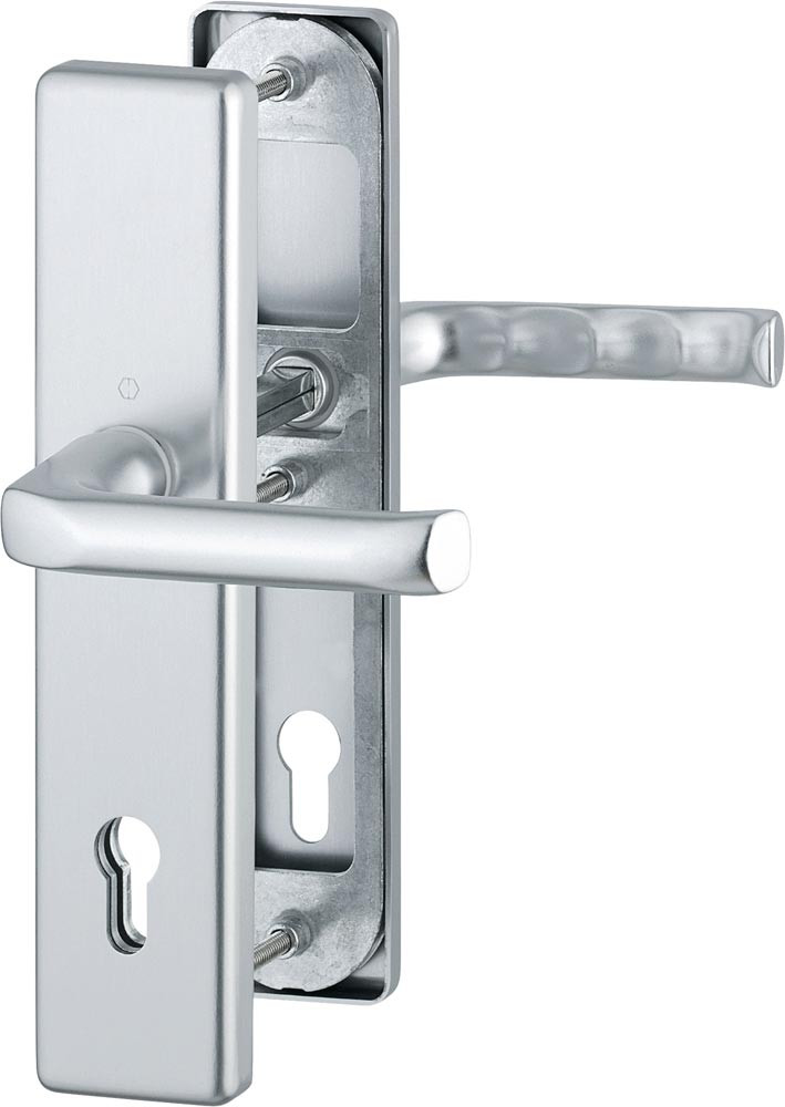 für Abschlusstüren · einbruchhemmend nach DIN 18257 · Außenschild-Randhöhe 12 mm · Stahl-Unterkonstruktion im Außen-und Zamak-Unterkonstruktion im Innenschild · FDW-Profilstift-Verbindung · sichtbare Verschraubung · einschließlich Befestigungsmaterial · Lochung PZ · DIN links / rechts · Widerstandsklasse ES 1