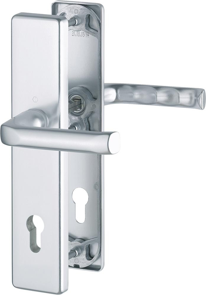 Drückergarnitur für Abschlusstüren · mit Teilstahleinlage als Anbohrschutz · Knopfschild-Randhöhe: 12 mm · mit 3-facher sichtbarer Verschraubung · mit Stahl-Nocken · Lochung PZ · DIN links / rechts · Widerstandsklasse ES 0