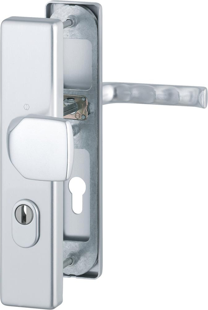 für Abschlusstüren mit ZA · geprüft nach DIN 18257 · Unterkonstruktion: außen Stahl, innen Aluminium, Stütznocken · Wechselgarnituren mit gekröpftem Knopf · Zylinderabdeckung: gehärteter Stahl, für vorstehende Zylinderlänge 10-18 mm · HOPPE FDW Profilstift-Verbindung · Lochung PZ · Widerstandsklasse ES 1 · Befestigung: verdeckt, durchgehend, Gewindeschrauben M6