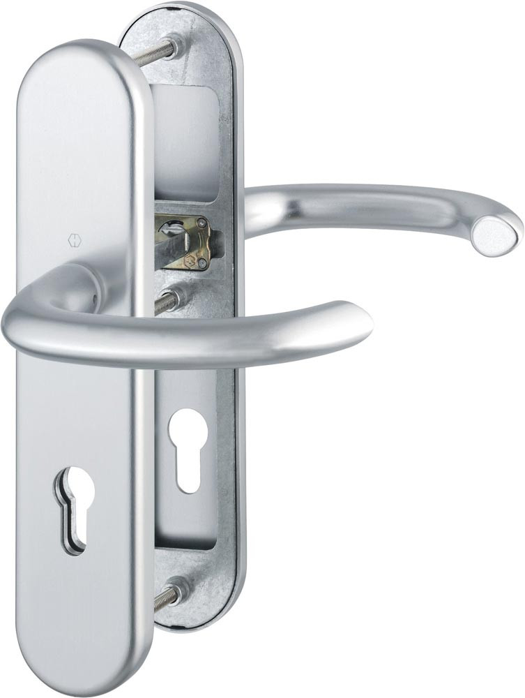 Aluminium-Schutz-Langschild-Garnitur für Außen-/Wohnungsabschluss-Türen · geprüft nach DIN EN 1906: 37-0142A (SK2), zertifiziert nach DIN 18257 ES1, Objekt-Garnitur (Gebrauchs-Kategorie 3) · Lagerung: Türgriffe lose (Wechselgarnitur: außen gekröpfter Knopf fest, ummontierbar), Rückholfeder rechts/links verwendbar, wartungsfreies Gleitlager · Verbindung: HOPPE-Schnellstift mit HOPPE-Vollstift (Drückergrt., Stift-/Lochteil) / HOPPE-FDW-Vollstift (Wechselgrt., Lochteil) · Unterkonstruktion: außen Stahl, innen Aluminium, Stütznocken · Befestigung: innen sichtbar, durchgehend, Gewindeschrauben M6 · Widerstandsklasse ES 1