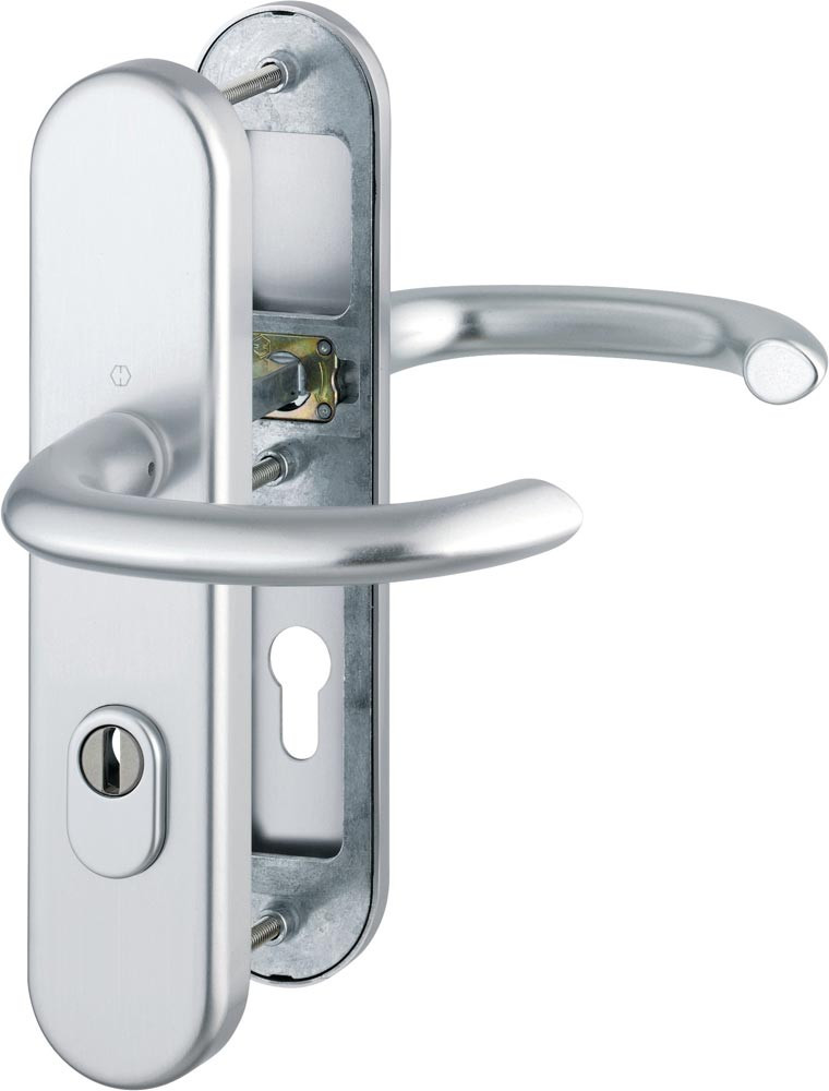 Aluminium-Schutz-Langschild-Garnitur mit Zylinderabdeckung für Außen-/Wohnungsabschluss-Türen · geprüft nach DIN EN 1906: 37-0142A (SK2), zertifiziert nach DIN 18257 ES1, Objekt-Garnitur (Gebrauchs-Kategorie 3) · Lagerung: Türgriffe lose (Wechselgarnitur: außen gekröpfter Knopf fest, ummontierbar), Rückholfeder rechts/links verwendbar, wartungsfreies Gleitlager · Verbindung: HOPPE-Schnellstift mit HOPPE-Vollstift (Drückergrt., Stift-/Lochteil) / HOPPE-FDW-Vollstift (Wechselgrt., Lochteil) · Zylinderabdeckung: gehärteter Stahl, für vorstehende Zylinderlänge 10-18 mm · Unterkonstruktion: außen Stahl, innen Aluminium, Stütznocken · Befestigung: innen sichtbar, durchgehend, Gewindeschrauben M6 · Widerstandsklasse ES 1