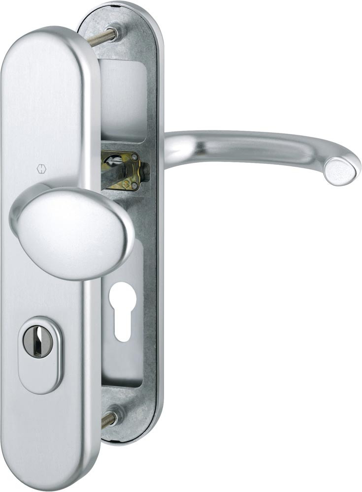 Aluminium-Schutz-Langschild-Garnitur mit Zylinderabdeckung für Außen-/Wohnungsabschluss-Türen · geprüft nach DIN EN 1906: 37-0142A (SK2), zertifiziert nach DIN 18257 ES1, Objekt-Garnitur (Gebrauchs-Kategorie 3) · Lagerung: Türgriffe lose (Wechselgarnitur: außen gekröpfter Knopf fest, ummontierbar), Rückholfeder rechts/links verwendbar, wartungsfreies Gleitlager · Verbindung: HOPPE-Schnellstift mit HOPPE-Vollstift (Drückergrt., Stift-/Lochteil) / HOPPE-FDW-Vollstift (Wechselgrt., Lochteil) · Zylinderabdeckung: gehärteter Stahl, für vorstehende Zylinderlänge 10-18 mm · Unterkonstruktion: außen Stahl, innen Aluminium, Stütznocken · Befestigung: innen sichtbar, durchgehend, Gewindeschrauben M6 · Widerstandsklasse ES 1