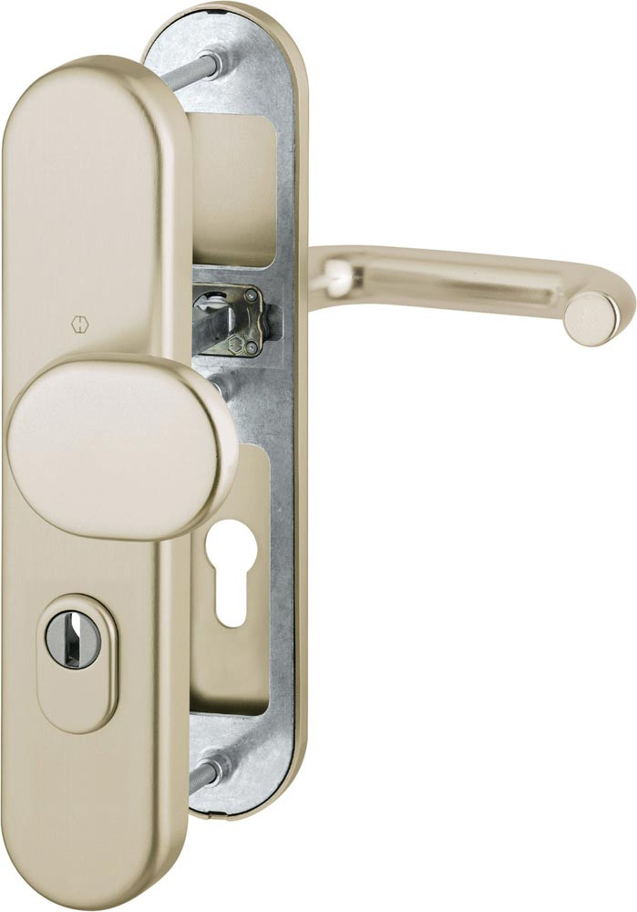 für Abschlusstüren · einbruchhemmend nach DIN 18257 · Knopfschild-Randhöhe: 12 mm · Stahlunterkonstruktion im Innen- und Außenschild · mit Rückholfeder-Paket · mit Schnellstift-Verbindung · DIN links / rechts verwendbar · hochfeste, verdeckte Verschraubung · einschließlich Befestigungsmaterial · PZ · Widerstandsklasse ES 1