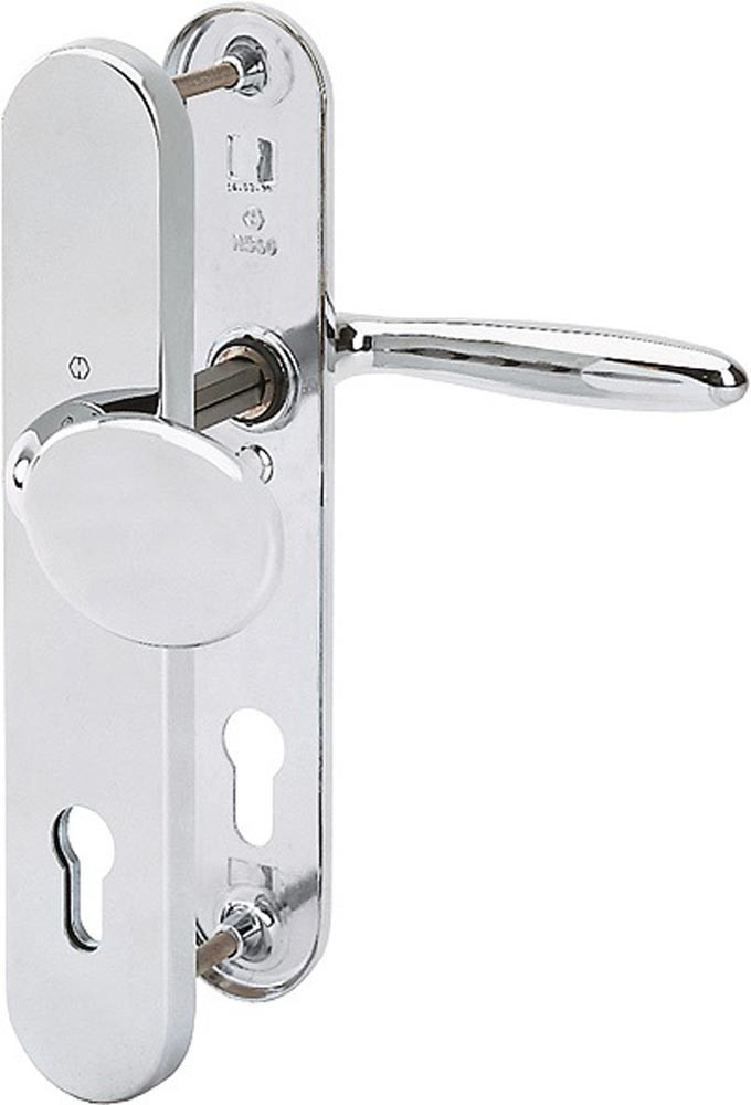 für Abschlusstüren · gehärteter Stahlanbohrschutz im Zylinderbereich · Wechselgarnituren mit gekröpftem Knopf · feststehend (ummontierbar) · mit Schnellstift-Verbindung · hochfeste, sichtbare Verschraubung · Lochung PZ · einschließlich Befestigungsmaterial M 6 · Anschlagrichtung DIN links / rechts · Widerstandsklasse KNS