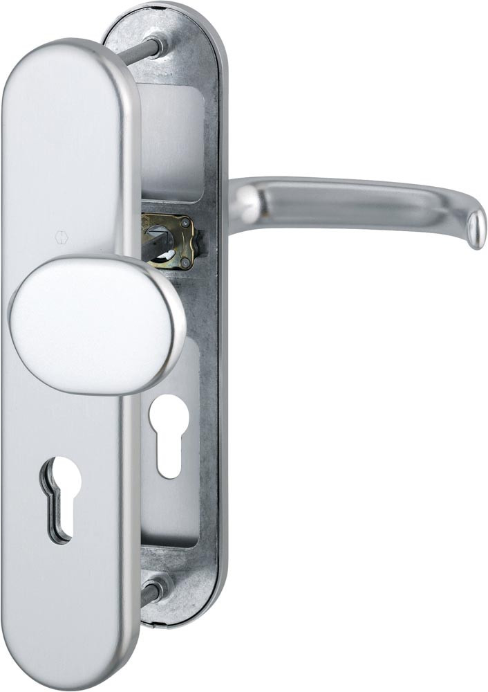 für Abschlusstüren · Stahl-Unterkonstruktion um Außen- und Zamak-Unterkonstruktion im Innenschild · außen: gekröpfter, feststehender Knopf · mit Rückholfeder · innen: loser Türgriff · Schnellstift-Verbindung (mit Hoppe FDW-Vollstift) · verdeckt, durchgehende Verschraubung · Lochung PZ · DIN links / rechts · Widerstandsklasse ES 1
