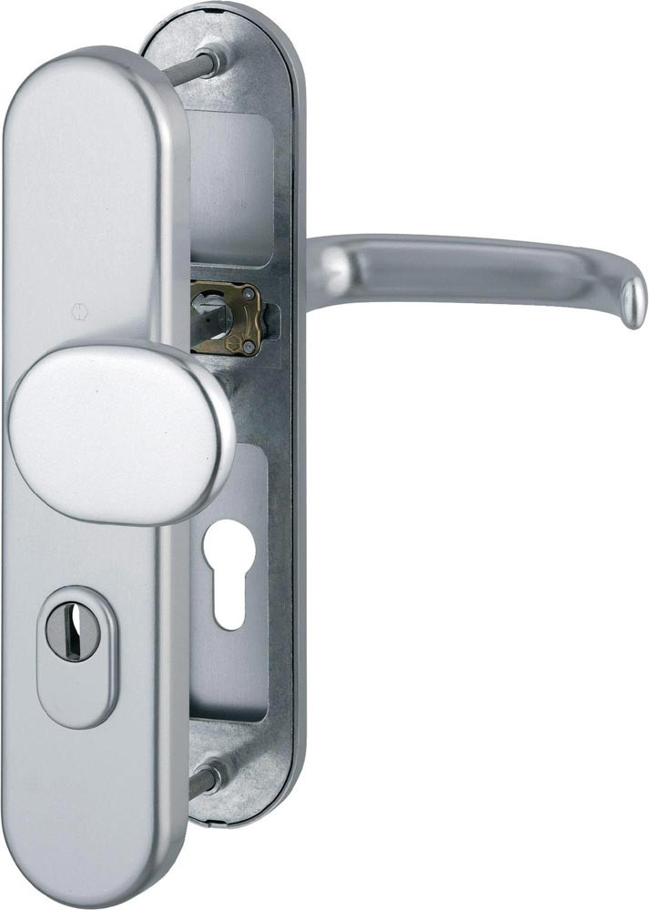 für Abschlusstüren · Stahl-Unterkonstruktion um Außen- und Zamak-Unterkonstruktion im Innenschild · außen: gekröpfter, feststehender Knopf · mit Rückholfeder · innen: loser Türgriff · Schnellstift-Verbindung (mit Hoppe FDW-Vollstift) · Zylinderabdeckung aus gehärtetem Stahl für vorstehende Zylinderlänge 10 - 18 mm · verdeckt, durchgehende Verschraubung · PZ · DIN links / rechts · Widerstandsklasse ES 1