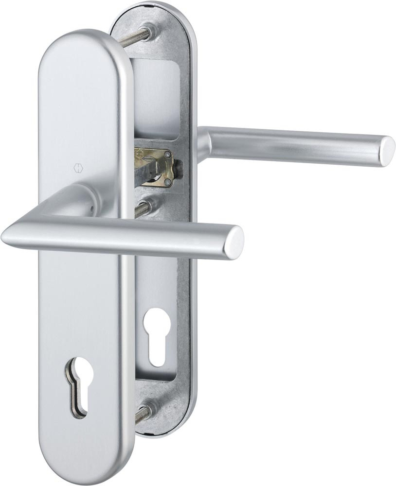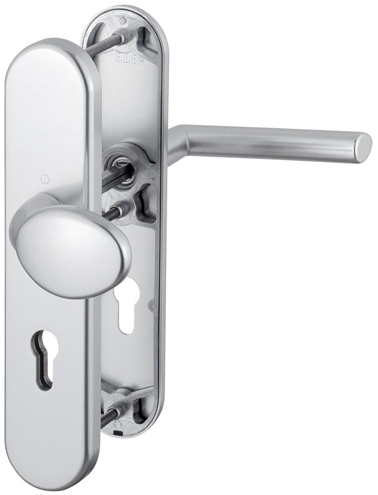 für Abschlusstüren · geprüft nach DIN 18257 · Unterkonstruktion: außen Stahl, innen Aluminium, Stütznocken · mit Rückholfeder-Paket · Wechselgarnituren mit gekröpftem Knopf · feststehend (ummontierbar) · mit Schnellstift-Verbindung · hochfeste, verdeckte Verschraubung · PZ · einschließlich Befestigungsmaterial M 6 · DIN links / rechts · Widerstandsklasse ES 1
