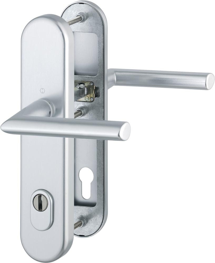 für Abschlusstüren mit ZA · geprüft nach DIN 18257 · Unterkonstruktion: außen Stahl, innen Aluminium, Stütznocken · mit Rückholfeder-Paket · Wechselgarnituren mit gekröpftem Knopf · feststehend (ummontierbar) · Zylinderabdeckung aus gehärtetem Stahl für vorstehende Zylinderlänge 10-18 mm · mit Schnellstift-Verbindung · hochfeste, verdeckte Verschraubung · PZ · einschließlich Befestigungsmaterial M 6 · DIN links / rechts · Widerstandsklasse ES 1
