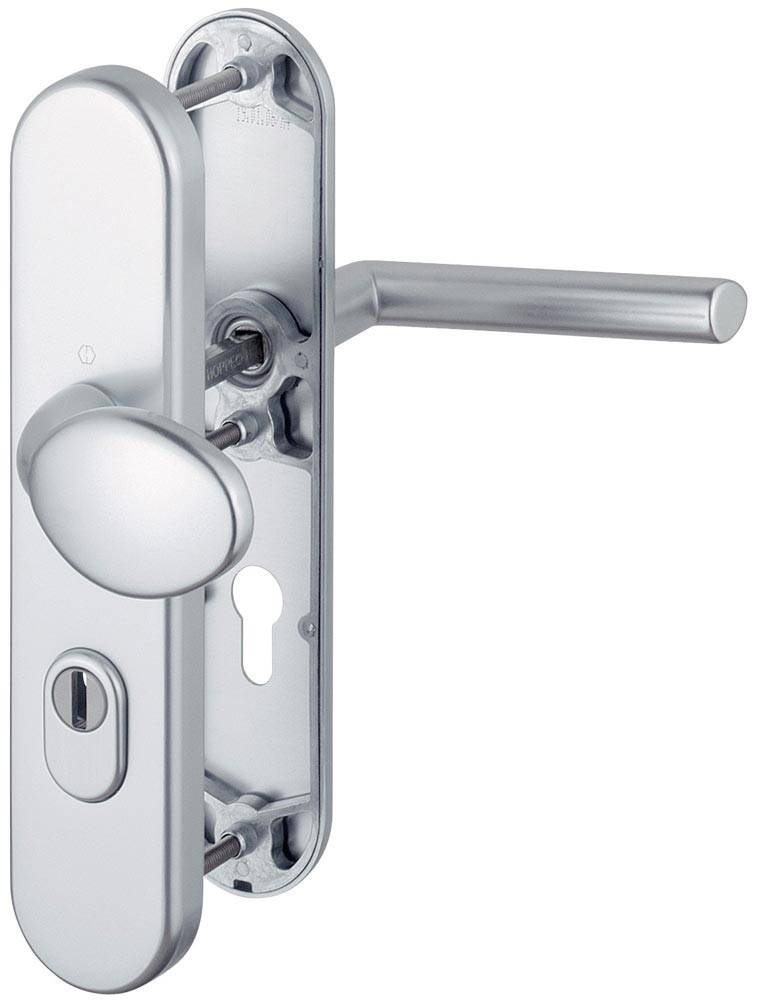 für Abschlusstüren mit ZA · geprüft nach DIN 18257 · Unterkonstruktion: außen Stahl, innen Aluminium, Stütznocken · mit Rückholfeder-Paket · Wechselgarnituren mit gekröpftem Knopf · feststehend (ummontierbar) · Zylinderabdeckung aus gehärtetem Stahl für vorstehende Zylinderlänge 10-18 mm · mit Schnellstift-Verbindung · hochfeste, verdeckte Verschraubung · PZ · einschließlich Befestigungsmaterial M 6 · DIN links / rechts · Widerstandsklasse ES 1