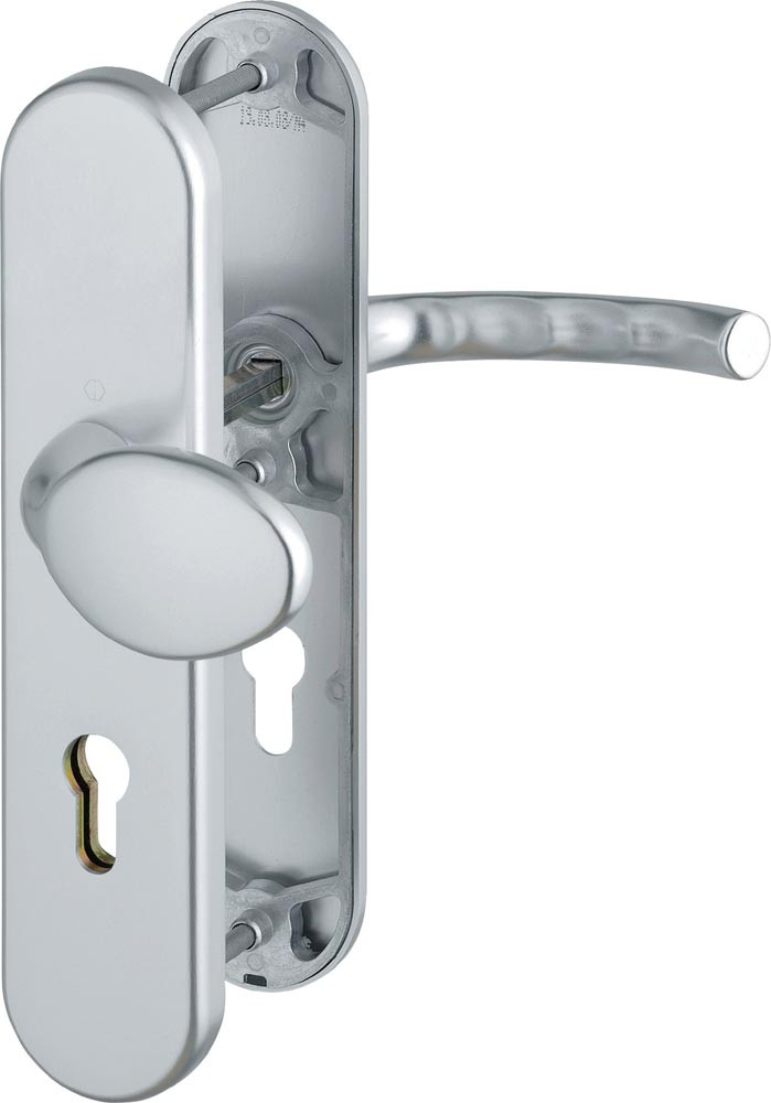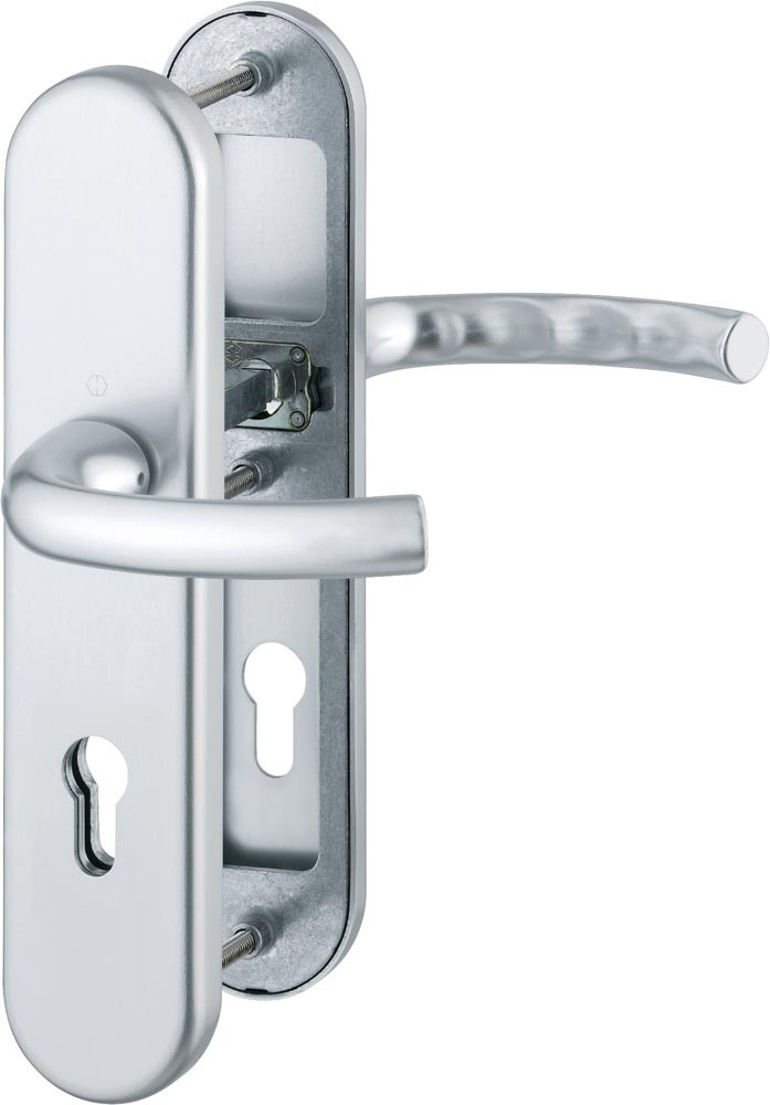 für Abschlusstüren · geprüft nach DIN EN 1906: zertifiziert nach DIN 18257 · Unterkonstruktion: außen Stahl, innen Aluminium, Stütznocken · mit Rückholfeder-Paket · loser Türgriff · mit Schnellstift-Verbindung · PZ · sichtbare Verschraubung · DIN links / rechts · Widerstandsklasse ES 1