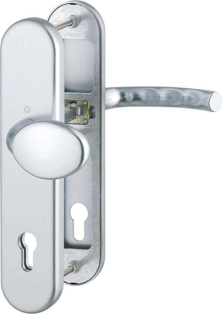 für Abschlusstüren · geprüft nach DIN EN 1906: zertifiziert nach DIN 18257 · Unterkonstruktion: außen Stahl, innen Aluminium, Stütznocken · mit Rückholfeder-Paket · loser Türgriff · mit Schnellstift-Verbindung · PZ · sichtbare Verschraubung · DIN links / rechts · Widerstandsklasse ES 1