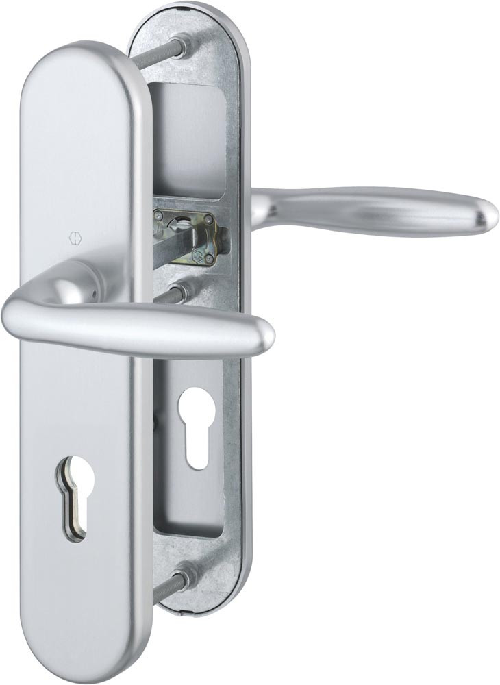 für Abschlusstüren · einbruchhemmend nach DIN 18257 · Stahl-Unterkonstruktion im Außen- und Innenschild · mit Rückholfeder-Paket · außen: gekröpfter, feststehender Kopf (ummontierbar) · innen: loser Türgriff, mit Schnellstift-Verbindung · hochfeste, verdeckte Verschraubung · Knopfschild-Randhöhe: 12 mm · DIN links / rechts · Widerstandsklasse ES 1