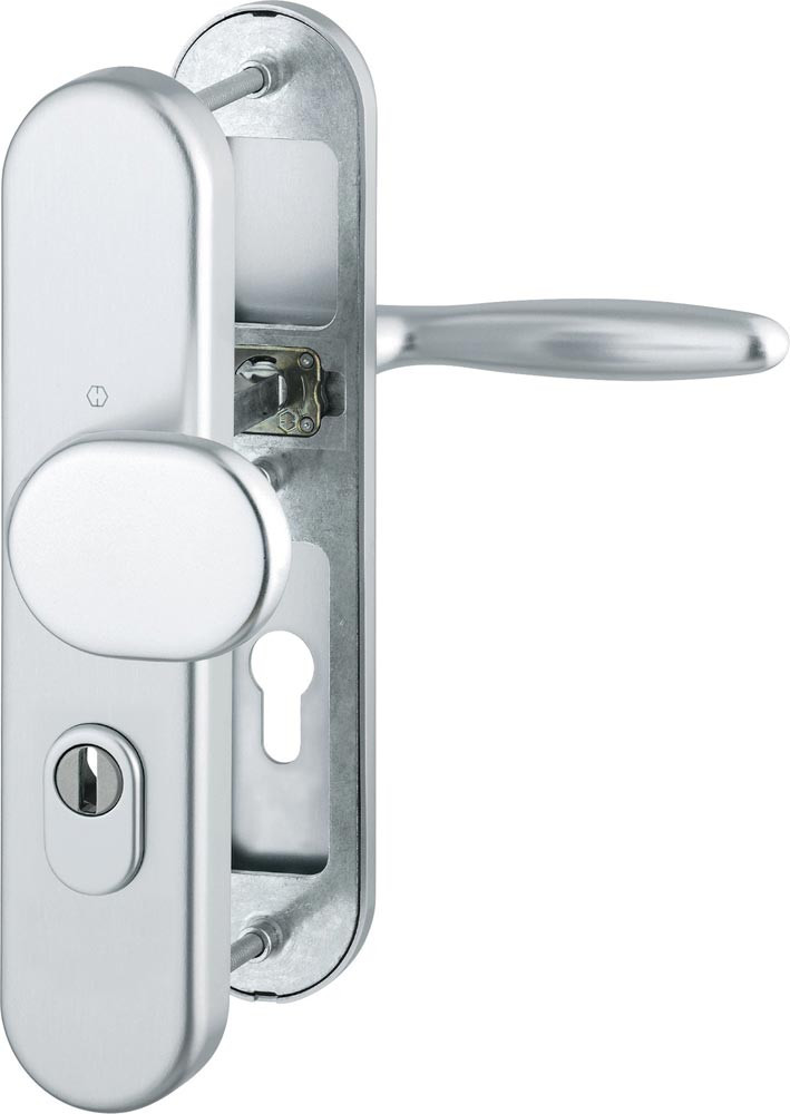 für Abschlusstüren · einbruchhemmend nach DIN 18257 · Stahl-Unterkonstruktion im Außen- und Innenschild · mit Rückholfeder-Paket · außen: gekröpfter, feststehender Kopf (ummontierbar) · innen: loser Türgriff, mit Schnellstift-Verbindung · hochfeste, verdeckte Verschraubung · Knopfschild-Randhöhe: 12 mm · DIN links / rechts · Widerstandsklasse ES 1 · Zylinderabdeckung: gehärteter Stahl, für vorstehende Zylinderlänge 10-18 mm