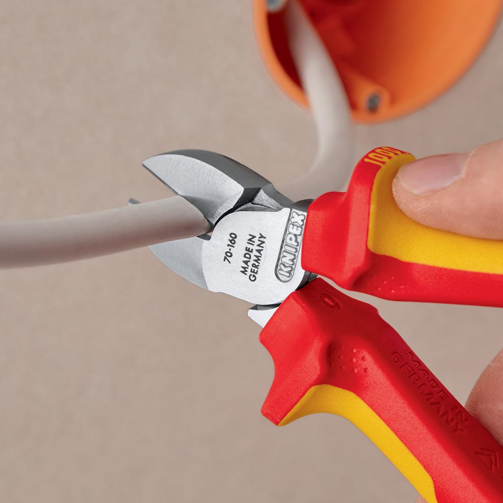 VDE-isoliert bis 1000 V · gefertigt gem. DIN EN/IEC 60900, stückgeprüft · schlanke Kopfform · sauberer Schnitt bei dünnen Cu-Drähten, auch an den Schneidenspitzen · Schneiden zusätzlich gehärtet, Schneidenhärte ca. 62 HRC · Vanadin-Elektrostahl, geschmiedet, mehrstufig ölgehärtet