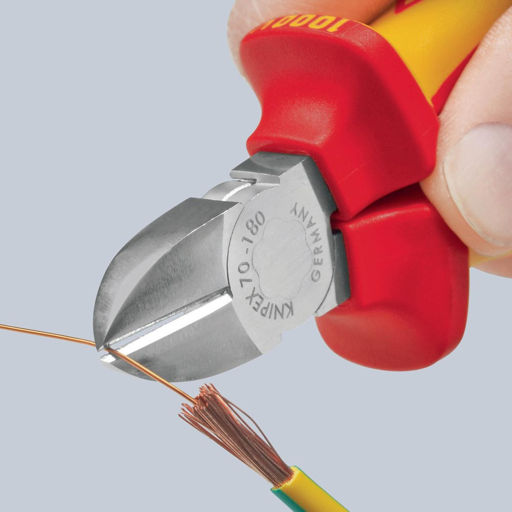 VDE-isoliert bis 1000 V · gefertigt gem. DIN EN/IEC 60900, stückgeprüft · schlanke Kopfform · sauberer Schnitt bei dünnen Cu-Drähten, auch an den Schneidenspitzen · Schneiden zusätzlich gehärtet, Schneidenhärte ca. 62 HRC · Vanadin-Elektrostahl, geschmiedet, mehrstufig ölgehärtet
