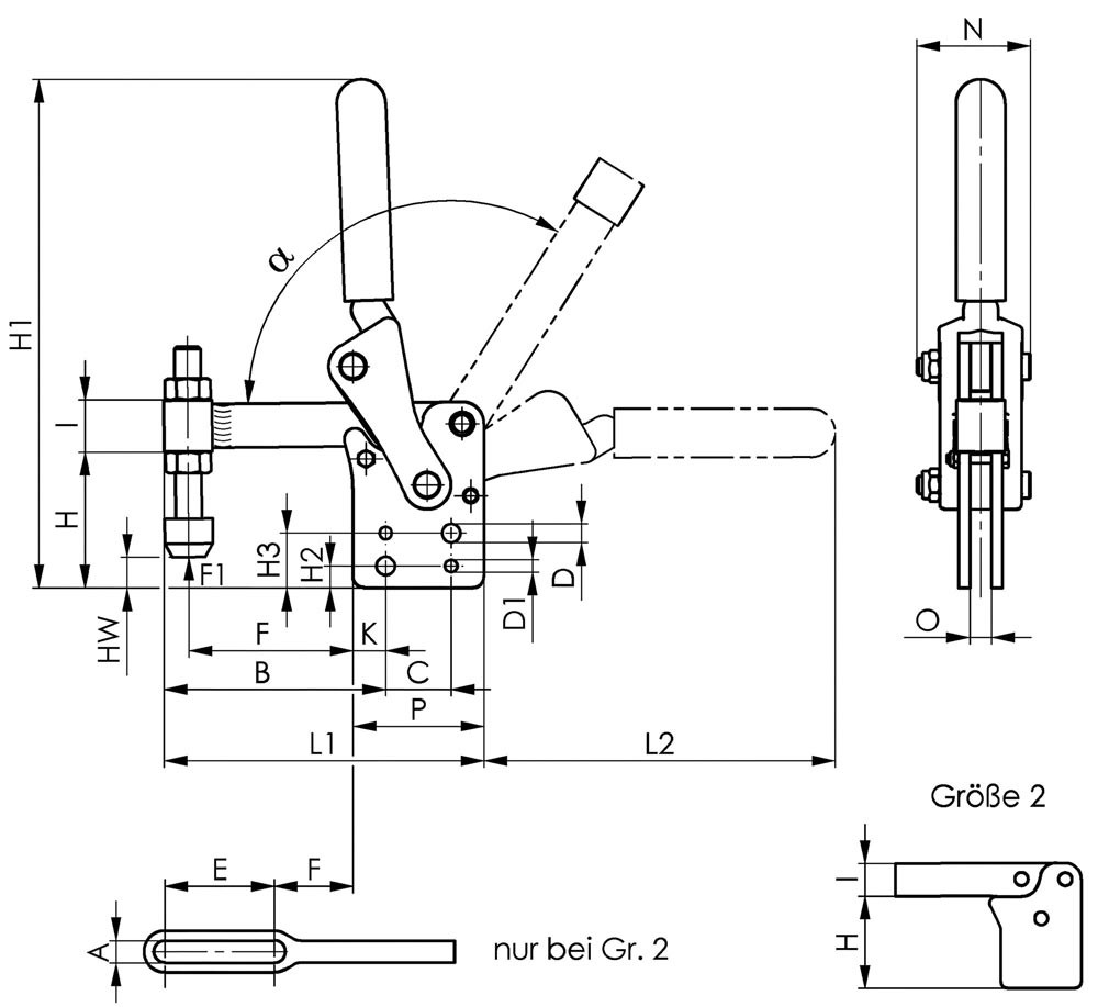 schwer · mit senkrechtem Fuß und Anschraublöchern · geriebene und einsatzgehärtete Lagerbuchsen · gehärtete, geschliffene und dauerhaft gefettete Bolzen · Klemmmutter am Hebelarm für einstellbare Gängigkeit · Werkstoff: Stahl, brüniert · Hebelarm aus Stahlguss, brüniert