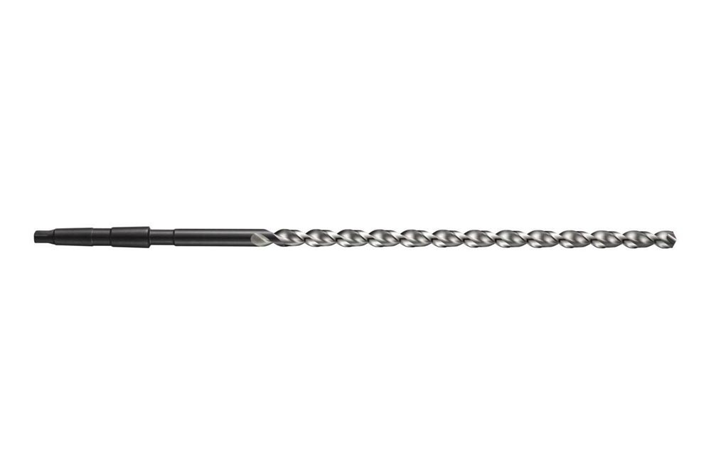 Extra langer Bohrer Bohrer mit Kegelschaft · Durchmesser 25mm mit einer Gesamtlänge von 555mm und einer Schneidenlänge von 365mm gemäß DIN 1870 (2) Standard mit 130° Spitzenwinkel · HSS mit blank und dampfangelassen · hochspiralisiert und parabolischem Kern für 20xD Bohrungen ohne Zentrierung in Stahl