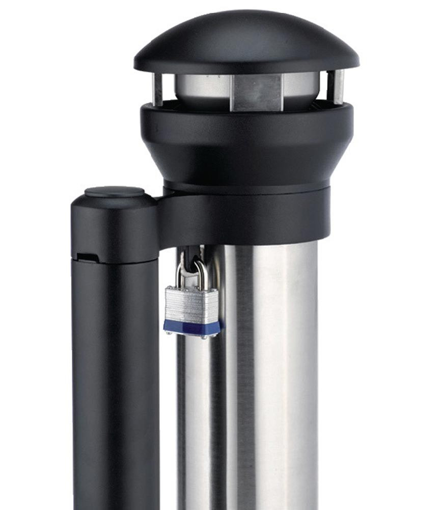aus Edelstahl · Ständer aus Stahlblech und schwarz beschichtet · wetterfest - geschwungener Verschluss verhindert Eindringen von Regenwasser · Bodenplatte lässt sich am Boden festschrauben · großes Fassungsvermögen, leicht zu entleeren
