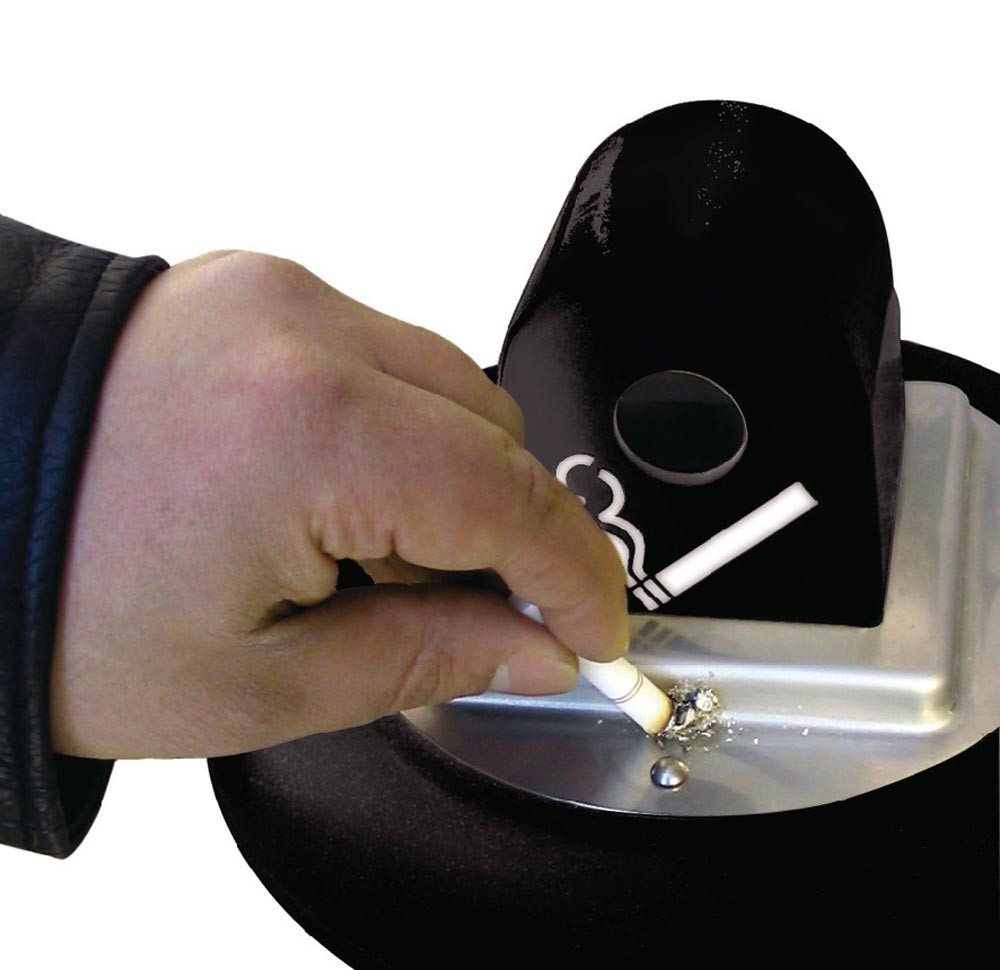 Korpus aus robustem, UV-beständigen Polyethylen, schwarz · Innenbehälter aus galvanisiertem Stahl · Zigaretten-Ausdrückplatte aus Edelstahl · Bodenplatte lässt sich am Boden festschrauben