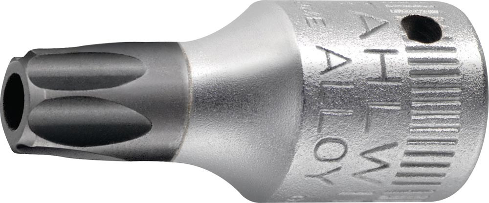 6,3 mm (1/4 ”)-Vierkantantrieb · mit Bohrung in der Antriebsspitze · für Schrauben mit Innen-TORX®-Profil (auch mit Sicherungsstift) · (TORX® TAMPER RESISTANT) · Chrom-Alloy-Stahl · verchromt · DIN 3120 / ISO 1174-1