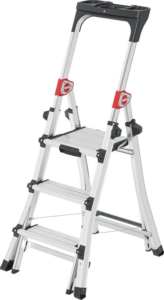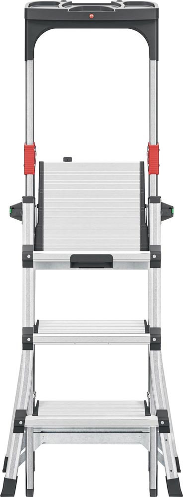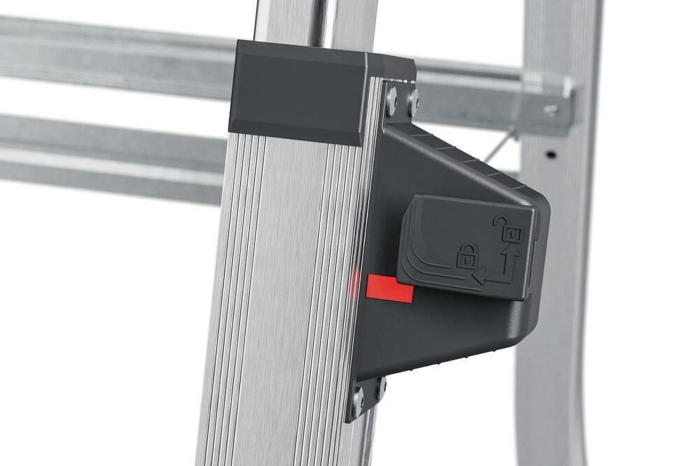 Aluminium · teleskopierbare Stufenstehleiter für flexible Arbeitshöhen · Steig- und Stützholme auf 3, 4 oder 5 Stufen einstellbar · Stufen-/Sprossen-Kombination · treppengängig einsetzbar, max. Treppenverstellung 440 mm · extragroße Standplattform B 299 x T 275 mm · Ablageschale mit unterschiedlich großen (Farb-) Dosen Abstellflächen · platzsparend · max. Gesamtbelastung 150 kg · Einfaches und sicheres Handling der Höhenverstellung durch Sicherheits-Verriegelungssystem mit Lock/Unlock-Indikator