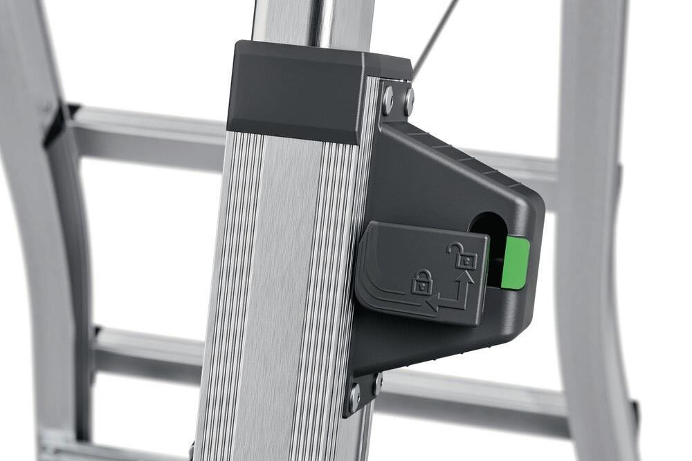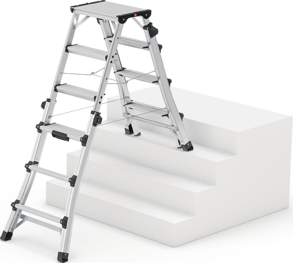 Aluminium · teleskopierbare Stufenstehleiter für flexible Arbeitshöhen · Steig- und Stützholme auf 2 x 4, 2 x 5 oder 2 x 6 Stufen einstellbar · beidseitig begehbar · Stufen-/Sprossen-Kombination mit rutschsicherer, geriffelter Auftrittsfläche · treppengängig einsetzbar, max. Treppenverstellung 430 mm · platzsparend · max. Gesamtbelastung 150 kg · Einfaches und sicheres Handling der Höhenverstellung durch Sicherheits-Verriegelungssystem mit Lock/Unlock-Indikator