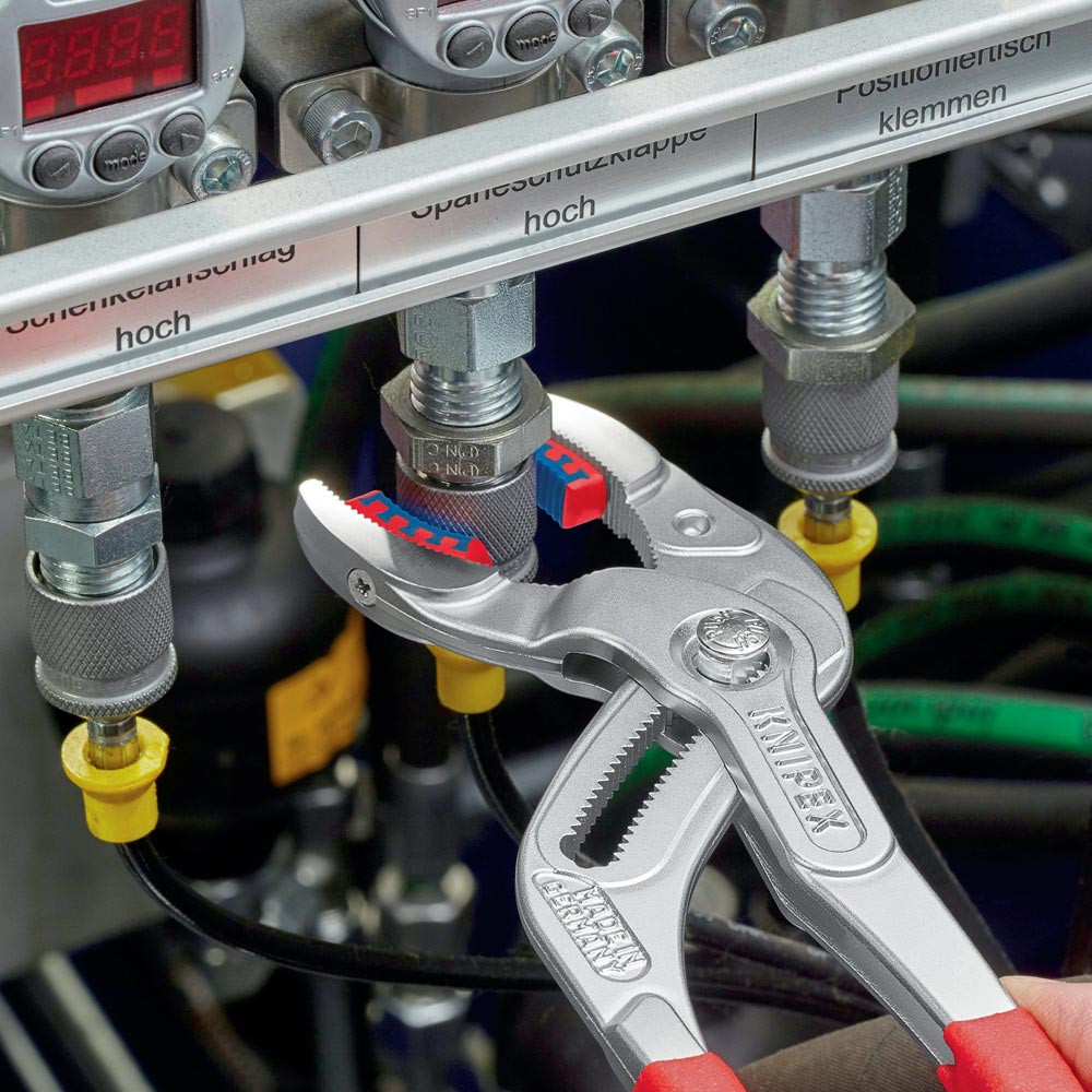 25-fach verstellbares, durchgestecktes Gelenk · Druckknopfverstellung · ergonomische Schenkelgeometrie · zum Anziehen und Lösen von Siphon-Verschraubungen, Kunststoff-Rohrverbindungen und runden Überwurfmuttern · Chrom-Vanadin-Elektrostahl, geschmiedet, ölgehärtet
