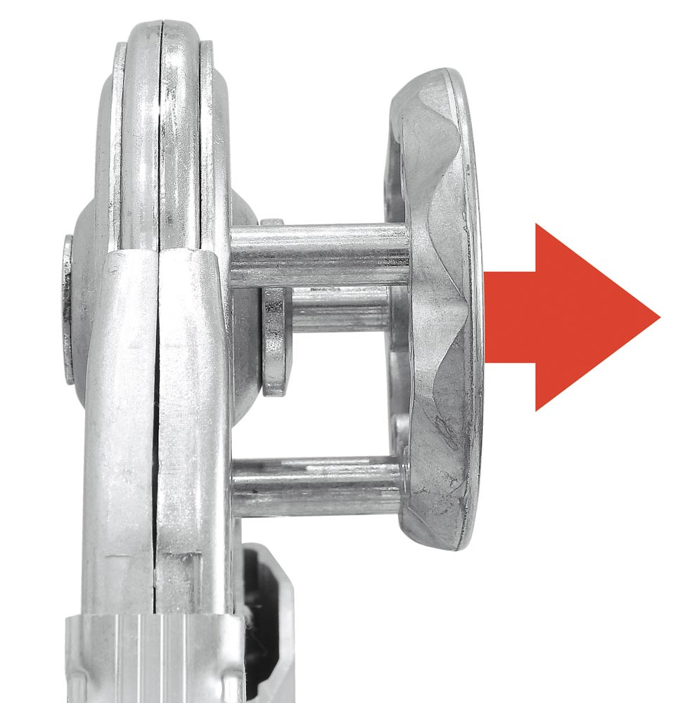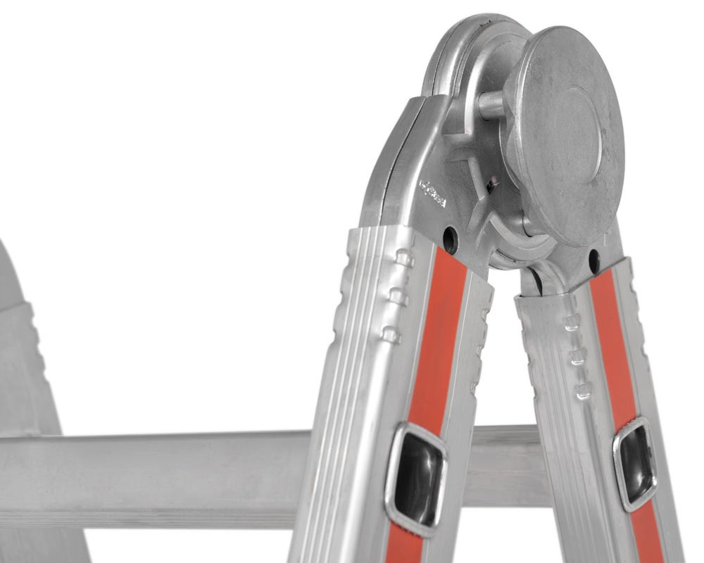 ∙ Leiterverstellung: ∙ Die seitlich am hochwertigen Bolzengelenk angebrachten Griffscheiben mit Duplex-Sicherung gewähren eine spielend leichte Handhabung beim Verstellen oder Umbauen der Leiter ∙ Durch Herausziehen der zuverlässig einrastenden Sperrelemente lässt sich die