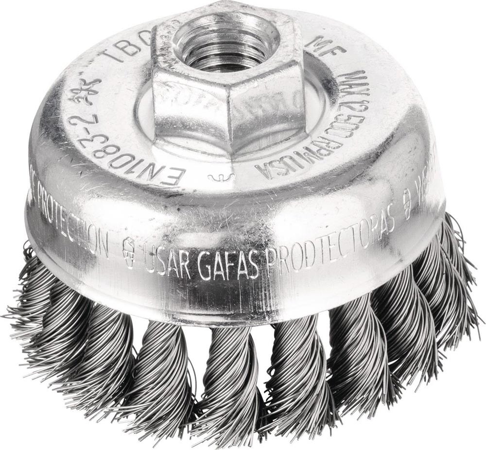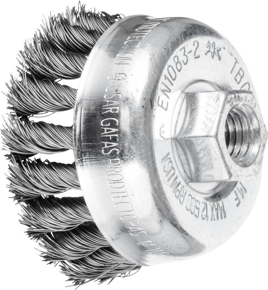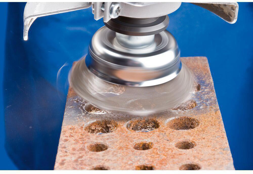 für schwere Bürstarbeiten wie Entgraten, Reinigen, Entrosten und Entzundern sowie zum Entfernen von Schweißspritzern · Besatzmaterial verfügt über eine hohe Zug- und Biegewechselfestigkeit · gewährleistet eine optimale Abnutzung des Drahtes sowie eine hohe Standzeit, auch bei extremen Bürstanwendungen Stahldraht hält Temperaturen bis 300 °C stand · M14