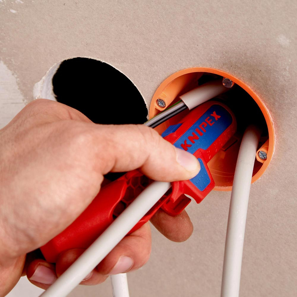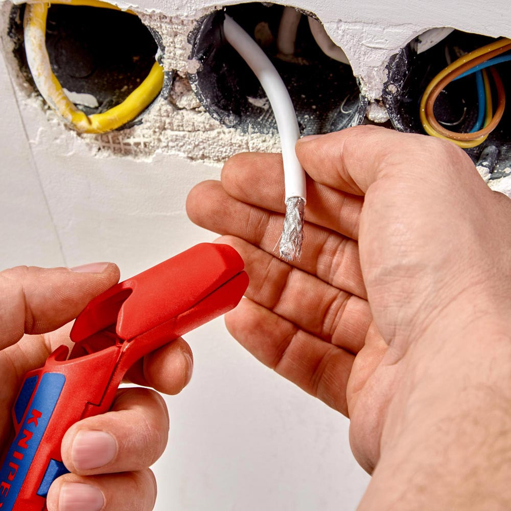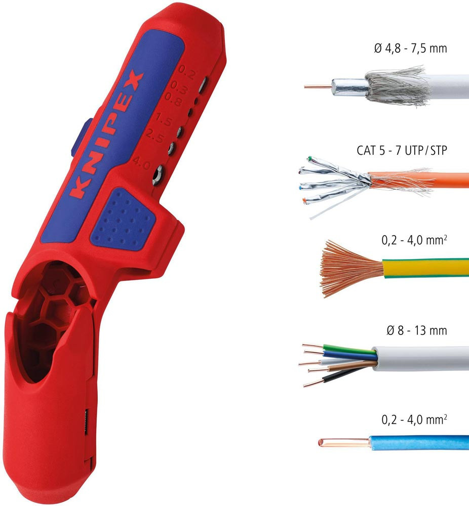 zum Abmanteln und Abisolieren · Rund- und Feuchtraumkabel von Ø 8 - 13 mm (z. B. NYM-Kabel 3 x 1,5 mm² bis 5 x 2 mm²) · Datenkabel (CAT 5 bis CAT 7), Twisted-Pair (UTP / STP) und Koaxial-Kabel (4,8 - 7,5 mm) · für die Querschnitte 0,2, 0,3, 0,8, 1,5, 2,5 und 4,0 mm² · tiefliegende Kabeleingänge leicht erreichen