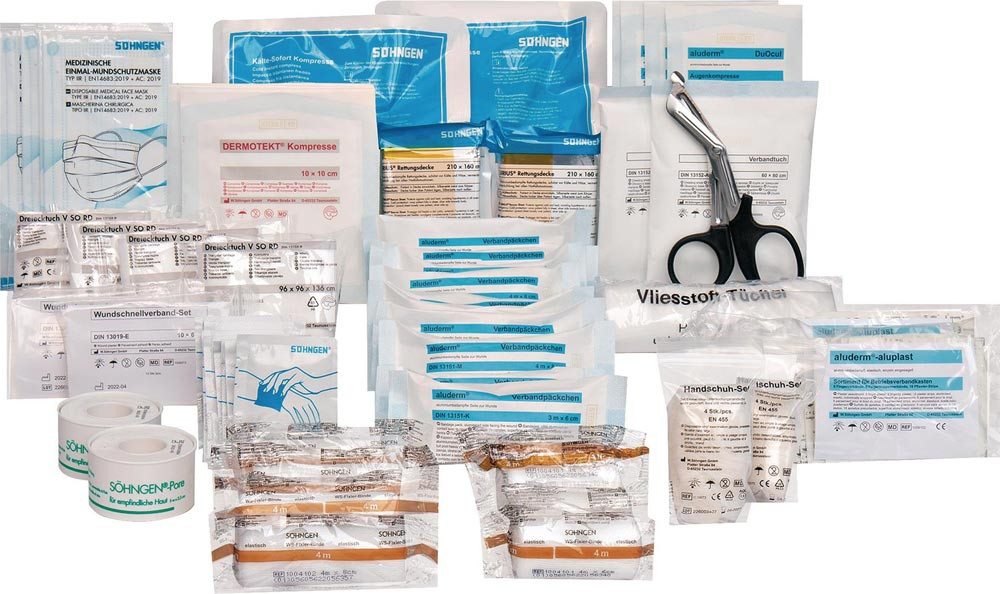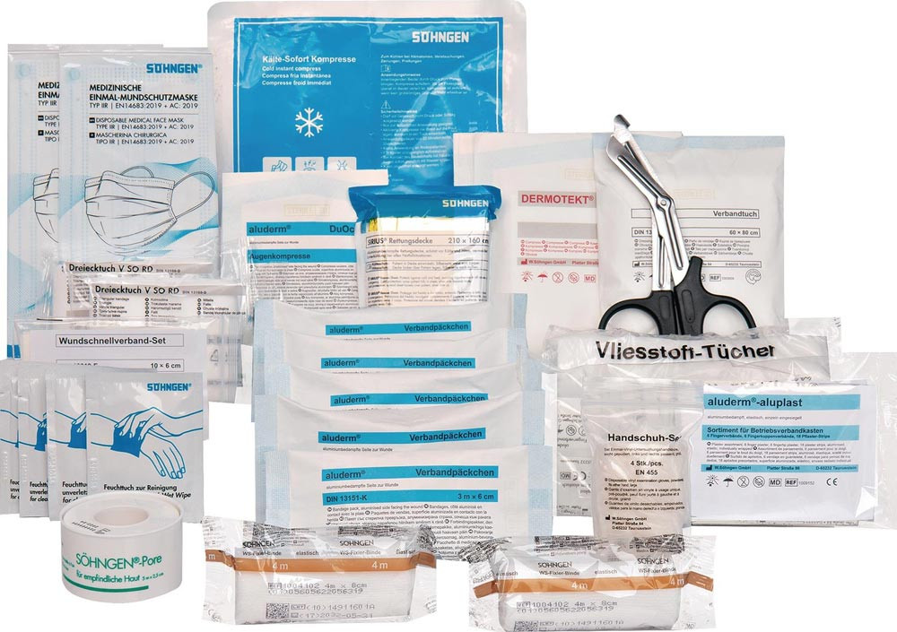 Sterile Verbandstoffe von SÖHNGEN® für Verbandschränke, Erste-Hilfe-Koffer klein + groß sind mit einem Herstellungsdatum und einem Haltbarkeitsdatum von 20 Jahren ab Herstellung versehen. · Der Inhalt entspricht den Mindestanforderungen nach DIN 13169-2021 hinsichtlich Ausführung und Qualität.