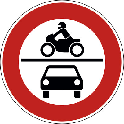 | VZ-Bedeutung | Verbot für Krafträder, auch mit Beiwagen, Kleinkrafträder und Mofas sowie für Kraftwagen und sonstige mehrspurige Kraftfahrzeuge |
