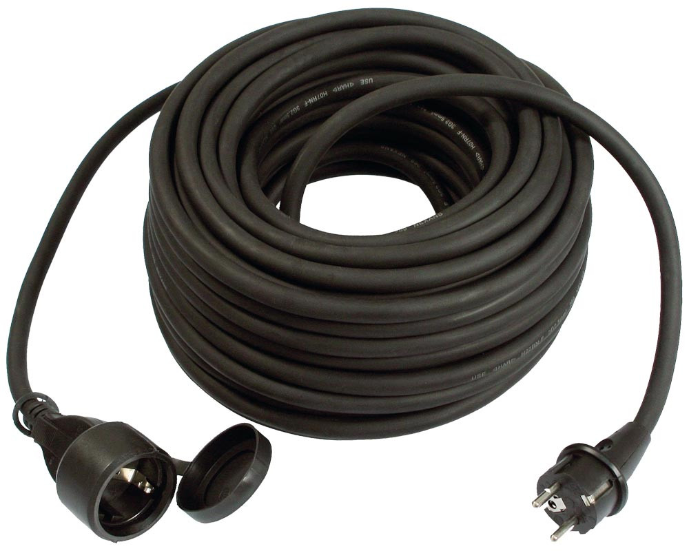 Gummi-Verlängerung · Schwarz · H07RN-F · angespritzter Schutzkontaktstecker und Schutzkontaktkupplung mit Abdeckkappe, im Folienbeutel · IP44 · geprüft nach VDE 0620-1, VDE 0285-525-21