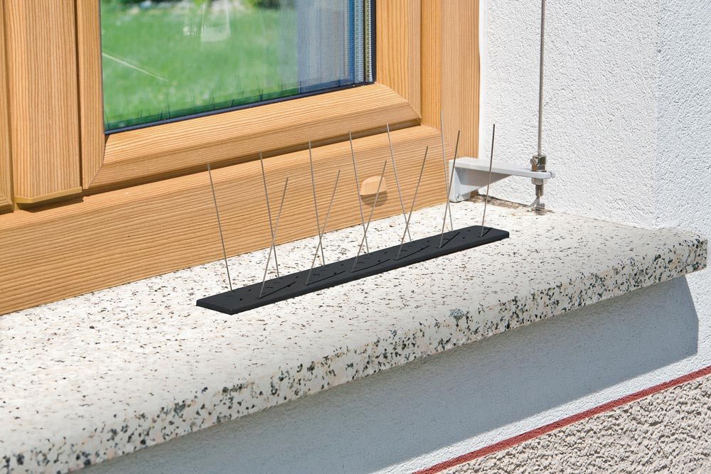 zuverlässige Abwehr von Tauben und anderen Vögeln · Basis-Set aus hochwertigem Kunststoff · individuell verlängerbar · dauerhaft einsetzbar · 36 Spikes, Höhe ca. 11 cm · bis zu 1 m Schutz durch 18 Modulplatten à 55 mm Länge · 55 x 1020 x 110 mm · inklusive Befestigungsmaterial: Schrauben und Dübel · Verlängerung durch Erweiterungsset 6439835 - Verdichtung durch Zusatzspikes 6439836
