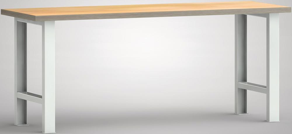 Untergestell aus U-Profilstahlrohr 80 x 40 mm · robuste Lackierung in lichtgrau, RAL 7035 · Buche-Multiplexplatte, Stärke 40 mm · Tragfähigkeit max. 800 kg bei gleichmäßig verteilter statischer Flächenlast · zerlegte Anlieferung, einfache Montage