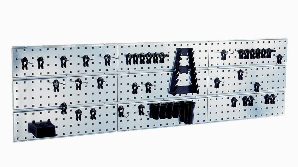 Werkzeughakenset m.Lochplatten Werkzeug-Wandpaneel x 3 + 44Clips 3 Lochplatten m.44 sort.Werkzeughaken B.1560xH.440mm