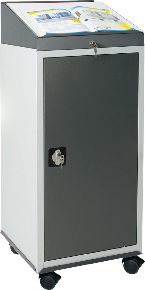 Stahlblechkonstruktion mit widerstandsfähiger Pulverbeschichtung · bestehend aus 1 Werkzeugschrank H 1000 x B 500 x T 500 mm mit 1 Schublade H 100 mm und 2 Fachböden, mit allseitigem Rand, Höhe 30 mm (lt. UVV nicht ausziehbar) · Schreibpultaufsatz mit abschließbarerem Deckel · Rollenuntersatz mit 4 Lenkrollen Ø 75 mm, Tragfähigkeit 75 kg pro Rolle · Schubladen, H 100 mm und Fachböden im 25-mm-Raster höhenverstellbar · Tragfähigkeit pro Fachboden/Schublade 35 kg · Flügeltür abschließbar mit Zylinderschloss und Drehriegelverschluss mit 3-Punkt-Verriegelung
