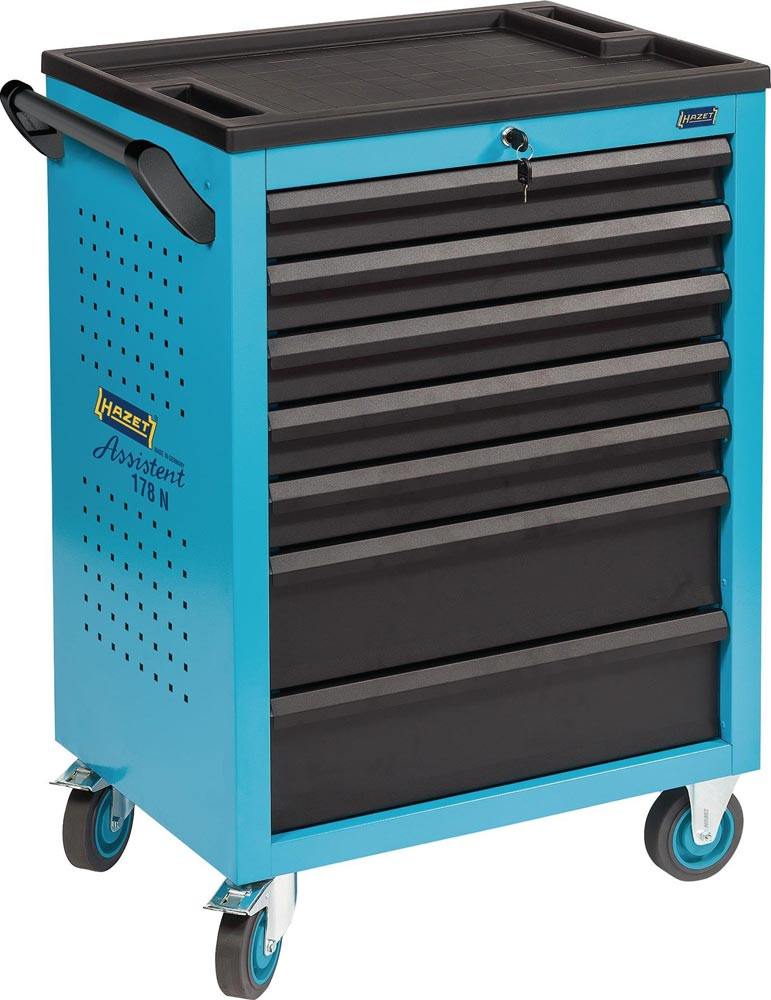 mit 7 Schubladen mit 100 % Auszug · Arbeitsplatte: Kunststoff, mit integrierten Ablagefächern · große kugelgelagerte Räder (125 mm), einfaches Bewegen auch bei hoher dynamischer Last · 2 Lenkrollen mit Doppelstopp: gebremste Rollen verhindert Wegrollen, gebremstes Schwenklager verhindert Drehen der Lenkrollen · Schutzring verhindert Eindringen von Schmutz und Fäden · 2-stufiges Verriegelungs-Konzept: Zentralverriegelung, abschließbar durch Zylinderschloss mit 2 Knickschlüsseln , Einzelverriegelung verhindert ungewolltes Öffnen · Elastikrollen · Höhe Arbeitsfläche: 1035 mm · individuelle Befestigungsmöglichkeiten durch Rechteck-Lochraster auf Seitenwänden · stabiler Fahrgriff fest am Korpus montiert · Umrandung der Arbeitsfläche schützt Teile vor Herabfallen · aus Stahlblech