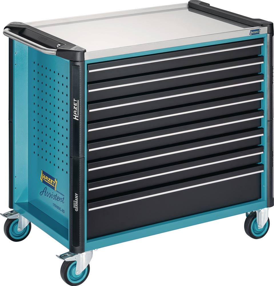extra tiefe Ausführung · mit setilicher Tür, Steckdosenleiste und 616tlg. Werkzeugsortiment · Edelstahl Arbeitsfläche · doppelwandige Konstruktion · Kantenschutz an allen vier Ecken · seitliche Schlossposition zur besseren Bedienbarkeit · Zentralverriegelung · Selbsteinzug der Schubladen · gegenseitige Auszugssperre für minimales Kipprisiko · 100 % Auszug mit kugelgelagerten Teleskopschienen · 40 kg Traglast pro Schublade · Gesamttragkraft statisch 1000 kg · 2 Lenkrollen mit Doppelstopp - Elastikrollen für ruhigen Lauf