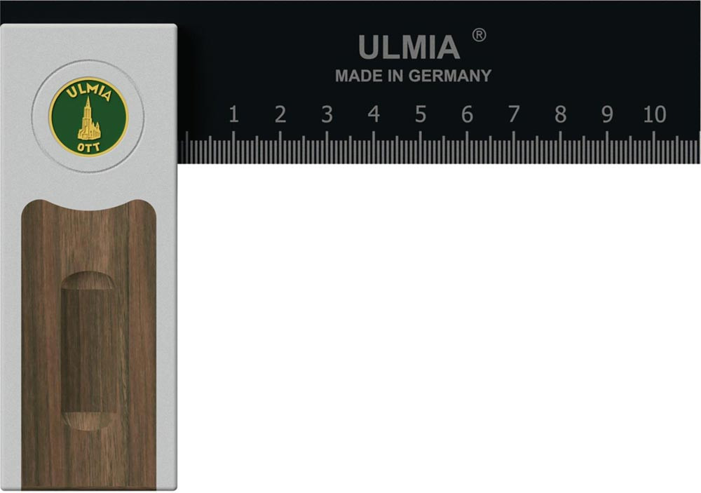 Präzisionsausführung · Kopfstück (Schenkel) aus Aluminium Präzisionsfrästeil · veredelt beidseitig durch Nußbaum-Holzeinlage mit Griffhohlkehlen · Stahlschiene gehärtet mit Maßskala und justierbar mittels Präzisionsjustierschraube