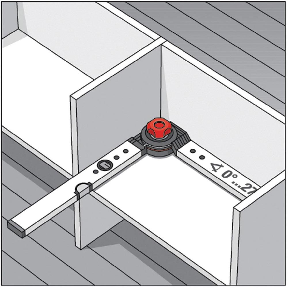 bestehend aus einer Alu-Profil-Wasserwaage mit einem variablen Alu-Profil-Schenkel · Wandstärke 1,6 mm · Messbereich 0 - 270° · die Indexscheibe des Gelenks kann in zwei verschiedenen Positionen eingelegt werden · danach können die Winkel wahlweise in 15°-Rasterung oder stufenlos eingestellt, fixiert und abgelesen werden
