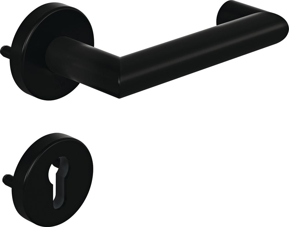 in R-Technik nach DIN 18255 und DIN EN 1906 aus mattem Polyamid, bestehend aus: Türdrücker 165.21PBR, Durchmesser 21,3 mm und Rundrosetten 305.21PBR und 306.23PB · der Drücker erfüllt die Vorgaben der DIN EN 179 · Gebrauchskategorie: Klasse 4 mit Vierkantstift 8 - 8,5 mm · Ausführungsvorschlag! Bitte alle Maße und baulichen Gegebenheiten im Auftragsfall prüfen!