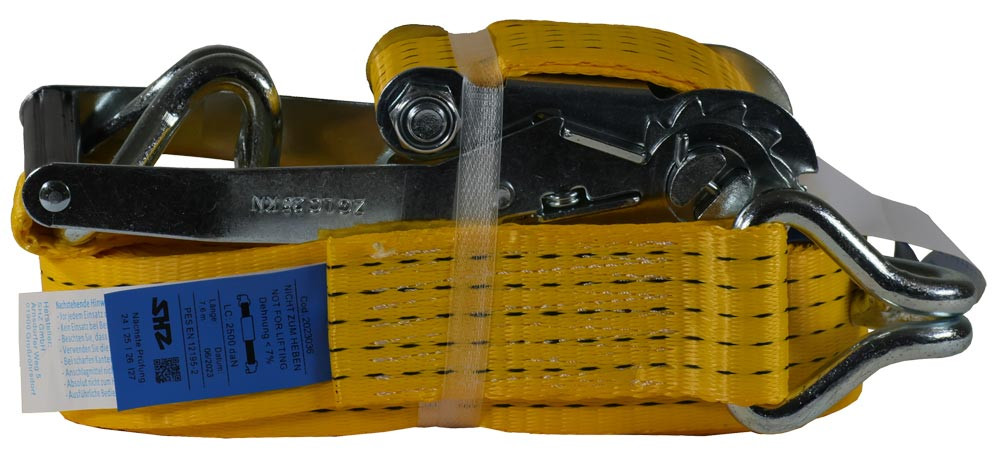 Zweiteilig mit Ratsche ∙ Mit Transportsicherung ∙ Gefertigt nach EN 12195-2 ∙ Material: PES ∙ Spitzhaken ∙ Bandbreite 50 mm
