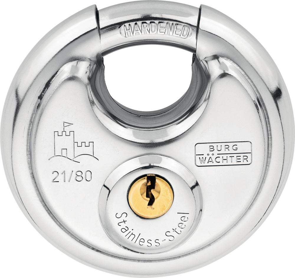 Circle 21 – Das praktische Rundbügelschloss aus Edelstahl Robust · langlebig und einfach zu bedienen: Das Rundbügelschloss Circle 21 sichert Türen · Tore und alle anderen verschließbaren Gegenstände. Schließlich sollen Fahrräder · Gartengeräte und sonstige Gegenstände nicht leichte Beute werden. Der Korpus des Vorhängeschlosses besteht aus robustem Edelstahl. Somit ist dieser sehr beständig gegen Korrosion. Und Sie haben auch nach langer Zeit keine Probleme · das Schloss sicher zu öffnen und zu verschließen. Angriffspunkte gegen Aufbruch minimiert Welche Vorteile bietet ein Rundbügelschloss wie das Circle 21 von BURG-WÄCHTER? Ganz einfach: Aufgrund der besonderen Scheiben-Form und der Bügelkonstruktion gibt es kaum Angriffspunkte für die üblichen Aufbruchswerkzeuge. Denn der Bügel ist zum großen Teil im Schlosskörper versteckt. Des Weiteren ist der Bügel vom Circle 21 gehärtet und verchromt. Übrigens zeigt das der geprägte Schriftzug „Hardened“ auf dem Bügel. Circle 21 in zwei Größen · gleichschließende Ausführung möglich Das Rundbügelschloss gibt es in zwei Größen. Das Modell 21 60 besitzt einen Durchmesser von 60 mm · die größere Variante 21 70 einen Durchmesser von 70 mm. Dadurch resultieren natürlich verschiedene Bügelweiten und Bügelhöhen. Somit finden Sie für Ihre ganz individuelle Anwendung bestimmt die richtige Größe. Des Weiteren sind beide Modelle gleichschließend lieferbar. Das heißt: Sie öffnen mit einem Schlüssel mehrere Rundbügelschlösser. Somit hat die Suche nach dem passenden Schlüssel endlich ein Ende. Apropos Schlüssel: Durch den Präzisions-Stiftzylinder öffnen und schließen Sie das Vorhangschloss äußerst bequem. Zudem ist das Schloss des Circle 21 aus Messing gefertigt. Somit bietet es einen schönen optischen Kontrast zum Korpus aus Edelstahl. Das Schloss wird serienmäßig mit zwei Schlüsseln ausgeliefert.
